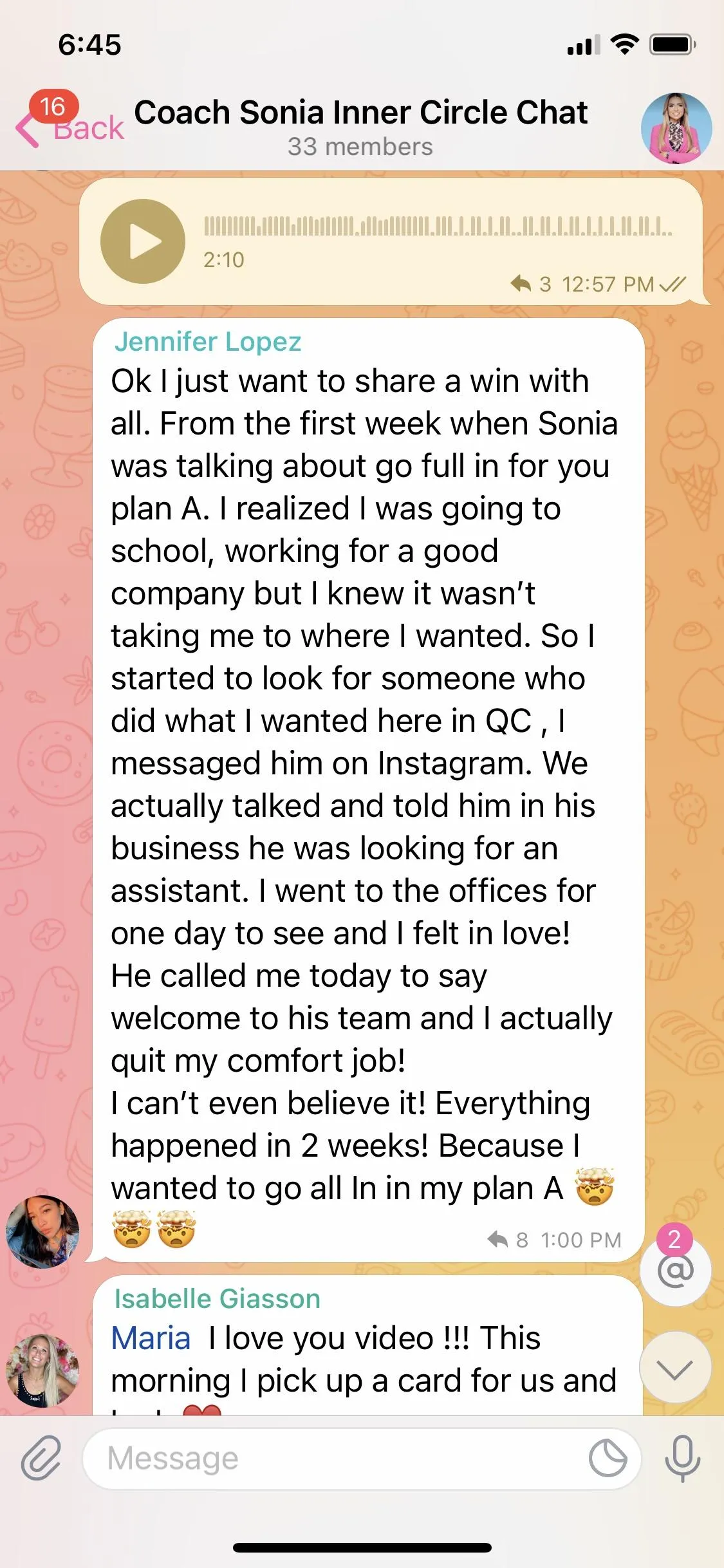 Chaque mois, participe à une session VIP en direct avec Sonia pour poser tes questions, recevoir des réponses personnalisées et progresser dans ta transformation au sein d’une communauté alignée sur tes valeurs et objectifs.