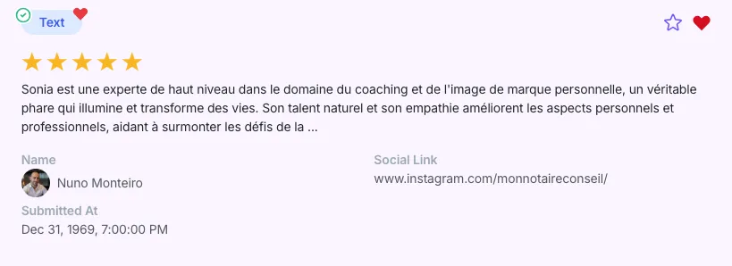 Sonia est une experte de haut niveau dans le domaine du coaching et de l'image de marque personnelle, un véritable phare qui illumine et transforme des vies. Son talent naturel et son empathie améliorent les aspects personnels et professionnels, aidant à surmonter les défis de la vie. Ses conseils attentifs et ses encouragements favorisent des progrès significatifs et des changements positifs. Je recommande vivement Sonia à tous ceux qui souhaitent atteindre leurs objectifs et libérer leur potentiel.