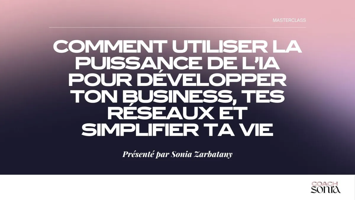 Cette Masterclass révolutionnaire te dévoile tout ce que l'intelligence artificielle peut apporter à ton business et à ta vie personnelle. Découvre des outils pratiques et des stratégies simples pour optimiser ton temps, augmenter ta productivité, et atteindre un nouveau niveau de succès. Une opportunité unique pour transformer ta façon de travailler et de vivre grâce à l’IA !